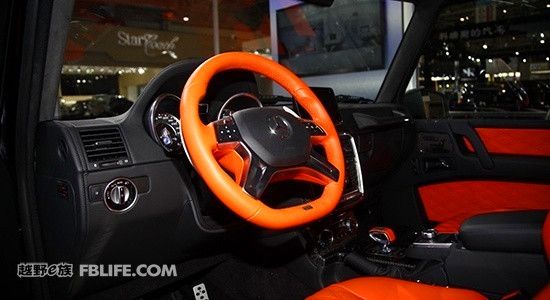 北京車(chē)展上的基于G63 AMG 6×6改裝而來(lái)的BRABUS 版700G 6 X 6 內(nèi)飾方面,該車(chē)采用了黑色和橘黃色的顏色搭配,強(qiáng)烈的顏色反差構(gòu)造出不錯(cuò)的視覺(jué)效果。四幅式真皮方向盤(pán)外圈也采用橘黃色真皮包裹,搭配顏色裝飾條,視覺(jué)效果極佳。擋把的設(shè)計(jì)類(lèi)似于飛機(jī)操作感,上面印有巴博斯的標(biāo)志,非常具有設(shè)計(jì)感。