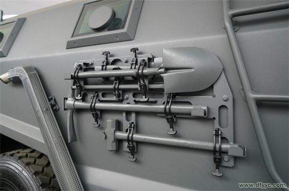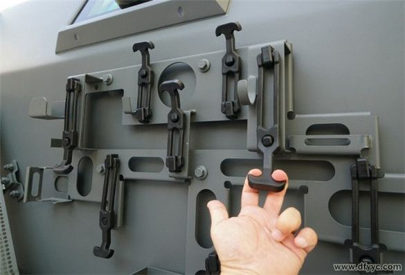 上圖是東風(fēng)四驅(qū)防雷反恐戰(zhàn)車右前側(cè)圍懸掛附加工具或補給品的懸掛特寫。用手較費勁的抻拉橡膠懸掛鎖具。備用工具通過橡膠掛具與背板固定在車身側(cè)面,背板拆卸后可以成為盤等工具。